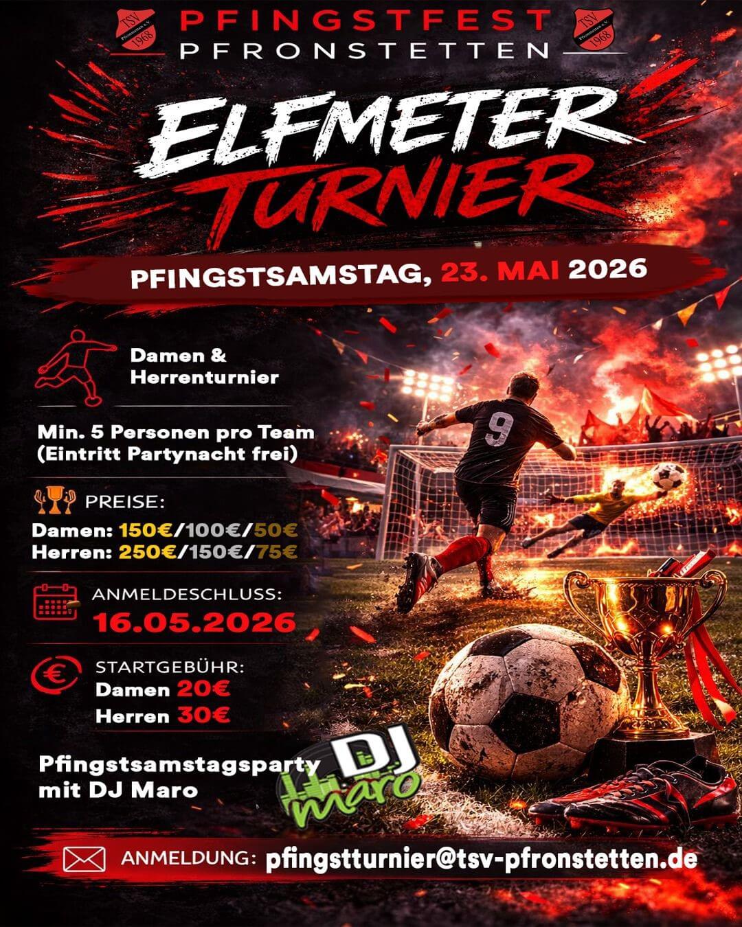 Pfingstsamstag, 23. Mai 2026ElfmeterturnierDamen- & Herrenturnier Min. 5 Personen pro Team (Eintritt Partynacht frei) Anmeldung: pfingstturnier@tsv-pfronstetten.de Pfingstsamstagsparty mit DJ Maro |