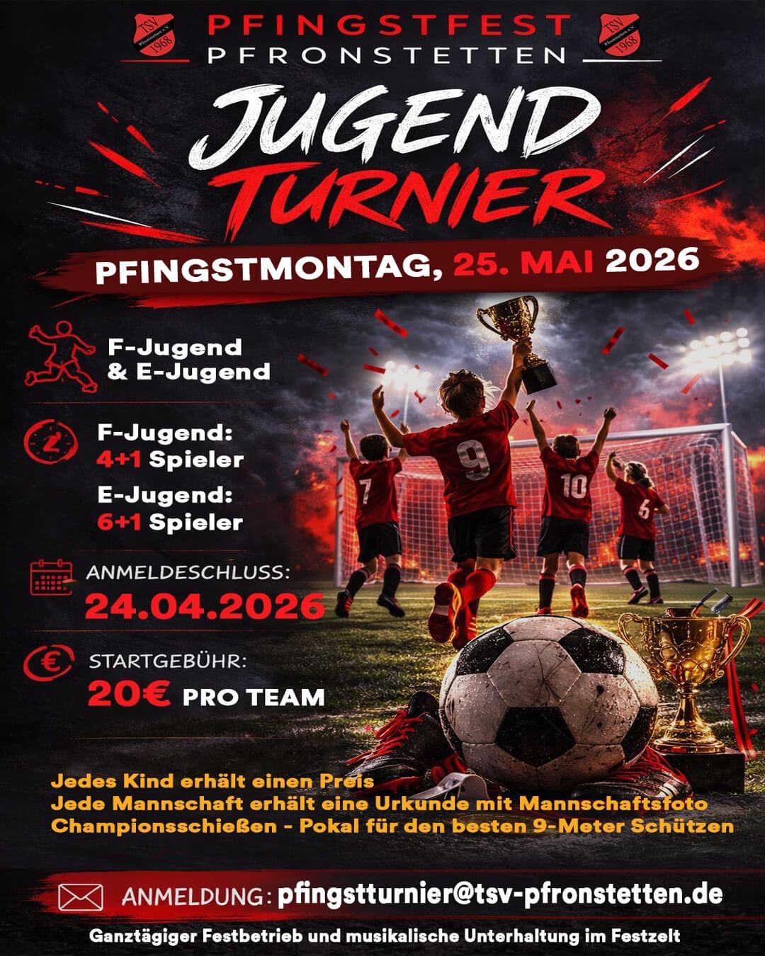 Pfingstmontag, 25. Mai 2026JugendturnierF-Jugend & E-Jugend F-Jugend: 4+1 Spieler E-Jugend: 6+1 Spieler Jedes Kind erhält einen Preis. Jede Mannschaft erhält eine Urkunde mit Mannschaftsfoto. Championsschießen - Pokal für den besten 9-Meter Schützen. Anmeldung: pfingstturnier@tsv-pfronstetten.de Ganztägiger Festbetrieb und musikalische Unterhaltung im Festzelt |