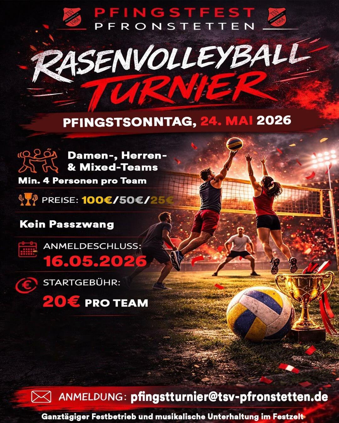 Pfingstsonntag, 24. Mai 2026Rasenvolleyball-TurnierDamen-, Herren- &Mixed-Teams Min. 4 Personen pro Team Kein Passzwang Anmeldung: pfingstturnier@tsv-pfronstetten.de Ganztägiger Festbetrieb und musikalische Unterhaltung im Festzelt |
